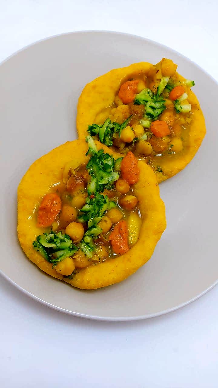 Pan Bara, Chutney de Tamarindo, curry de garbanzos, Chutney frio de pepinillos y Harissa
