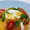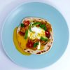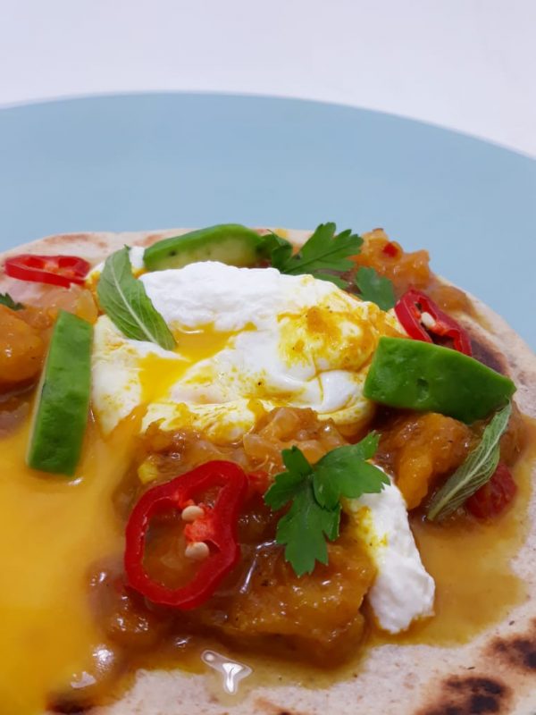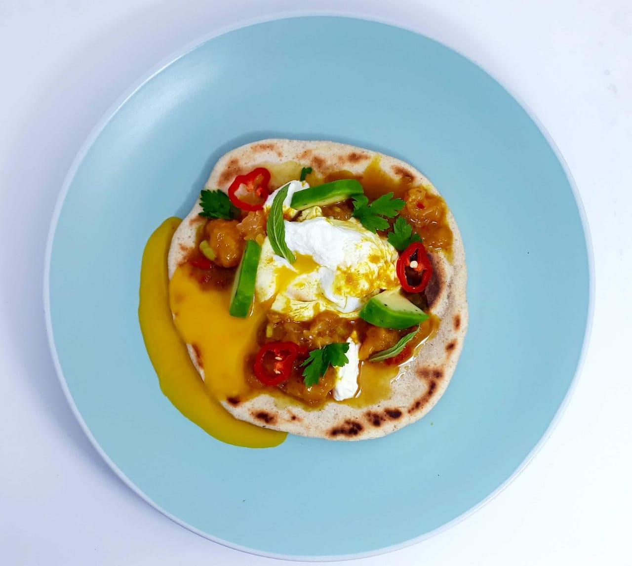 Pan Paratha, huevo pochado, Chutney de mango y mandarina